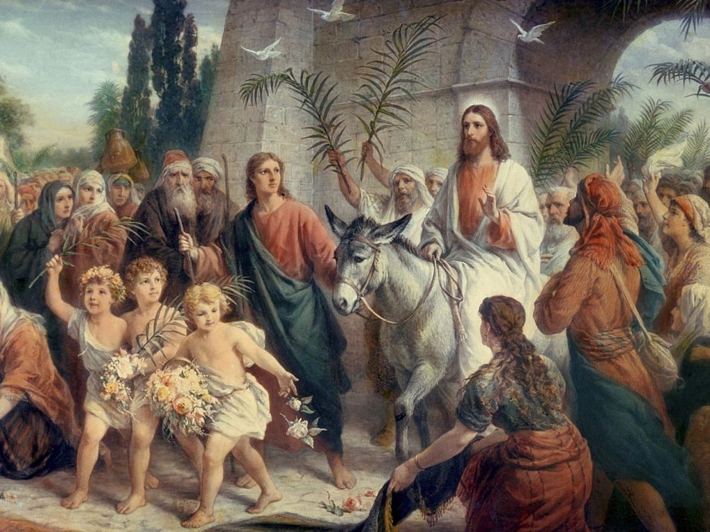 Sambil dielu-elukan, Yesus memasuki Yerusalem dengan menunggangi seekor keledai muda (bdk. Lukas 19:35). Jika seorang datang dengan kuda, bermakna akan terjadinya perang, maka penggunaan keledai bermakna sebaliknya. Keledai menandakan kedatangan seorang pembawa damai.