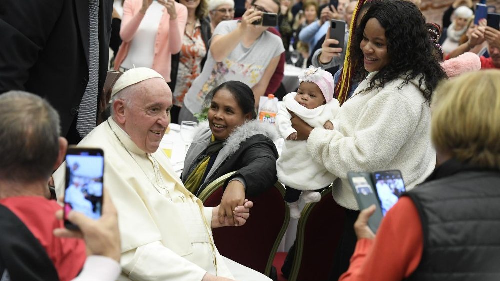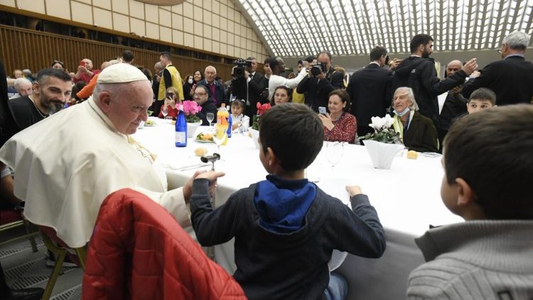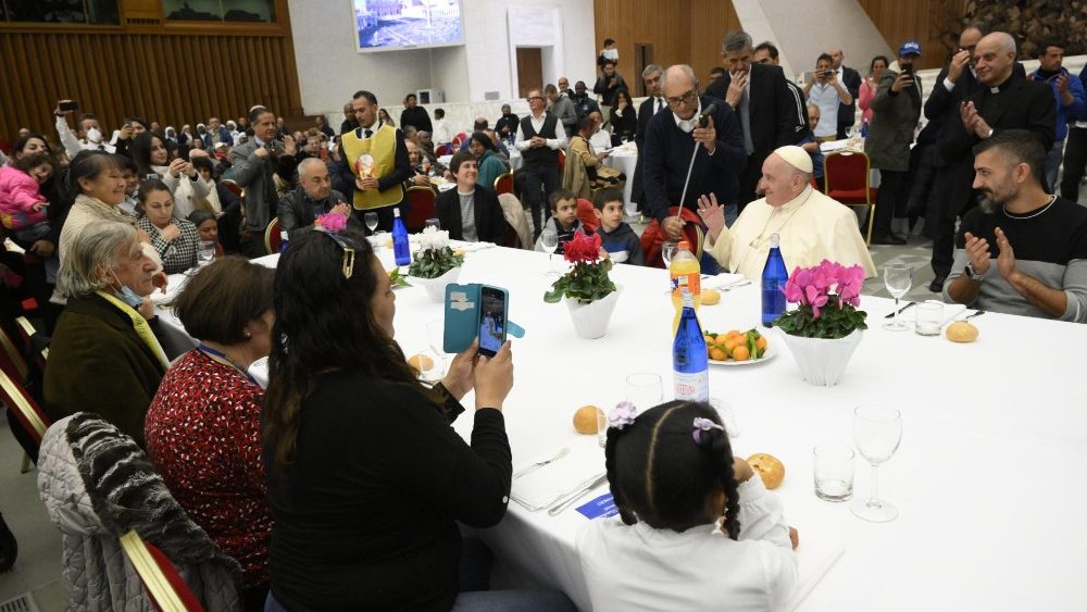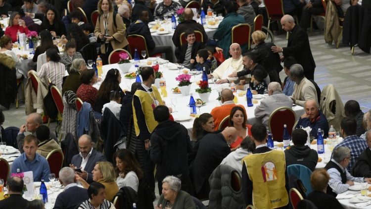 Paus Fransiskus menyambut lebih dari 1.300 orang yang dibantu oleh Caritas Roma dan Komunitas St. Egidio untuk makan siang khusus pada Hari Orang Miskin Sedunia, Minggu (13/11).