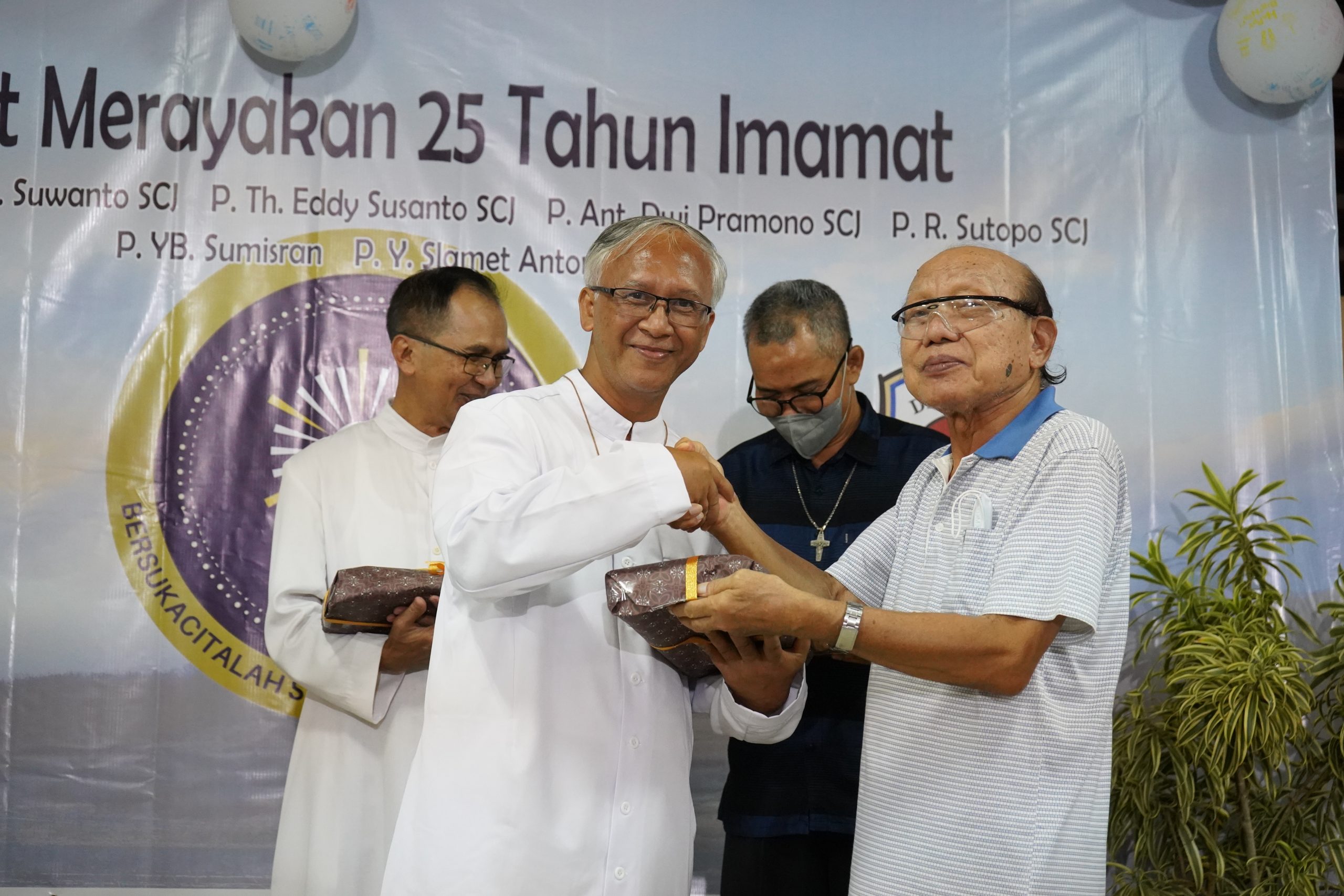 Romo Andreas Suparman SCJ menerima hadiah dari Romo Dhani SCJ | Foto: Dokumentasi Komsos Kapal/ Majalah FIAT