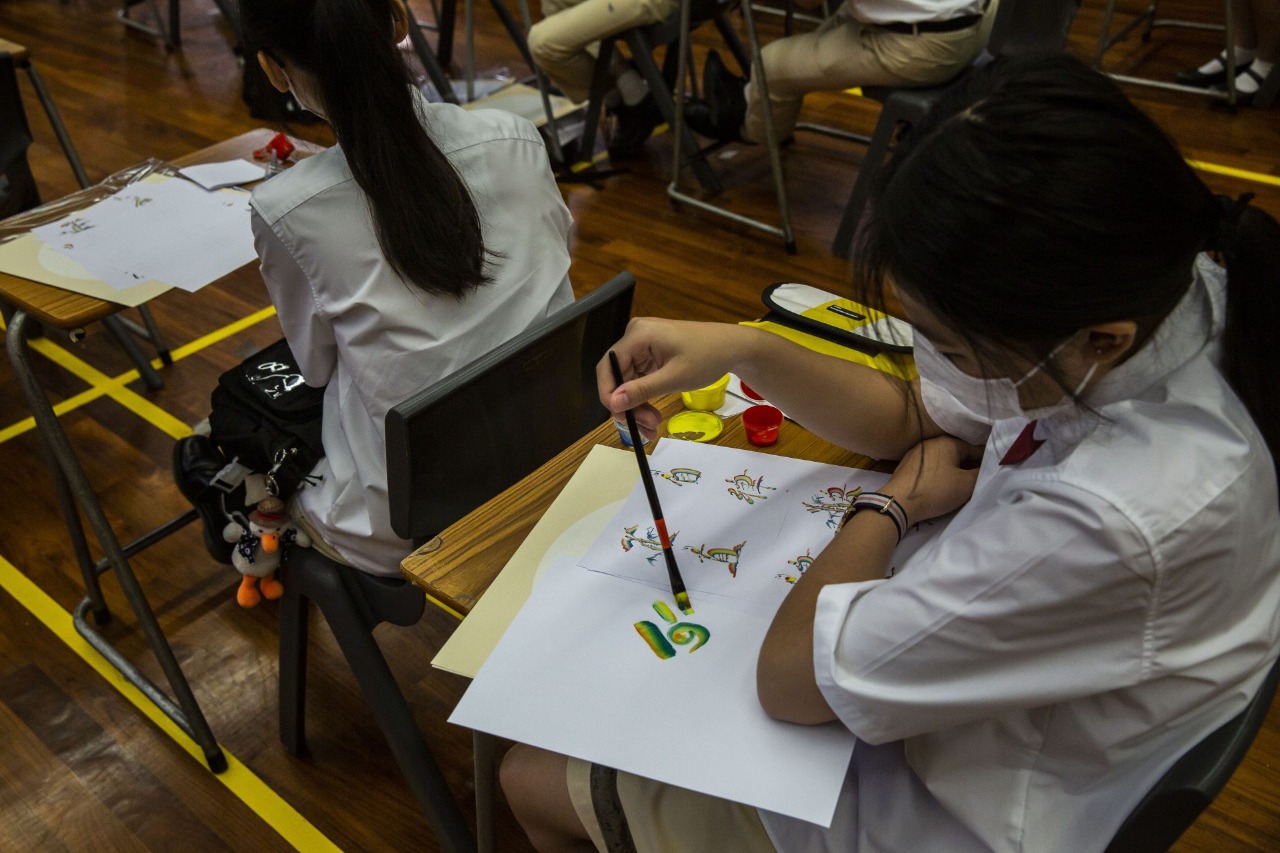 Siswa mengikuti latihan kaligrafi di sebuah sekolah di Hong Kong. (Foto AFP)