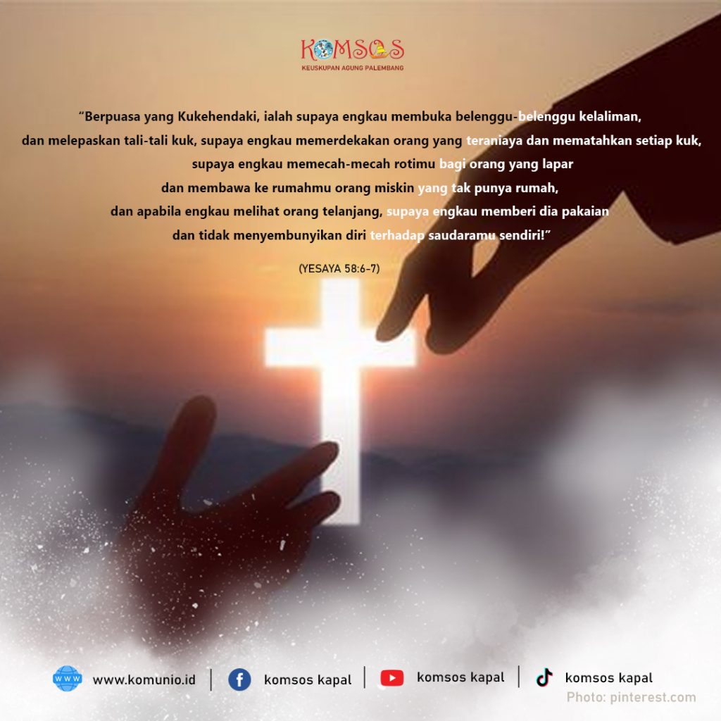 Bukan! Berpuasa yang Kukehendaki ialah: Engkau harus membuka belenggu-belenggu kelaliman dan melepaskan tali-tali kuk; membagi-bagikan rotimu bagi orang yang lapar dan membawa ke rumahmu orang miskin yang tak punya rumah, dan apabila engkau melihat orang telanjang, supaya engkau memberi dia pakaian, dan tidak menyembunyikan diri terhadap saudaramu sendiri!