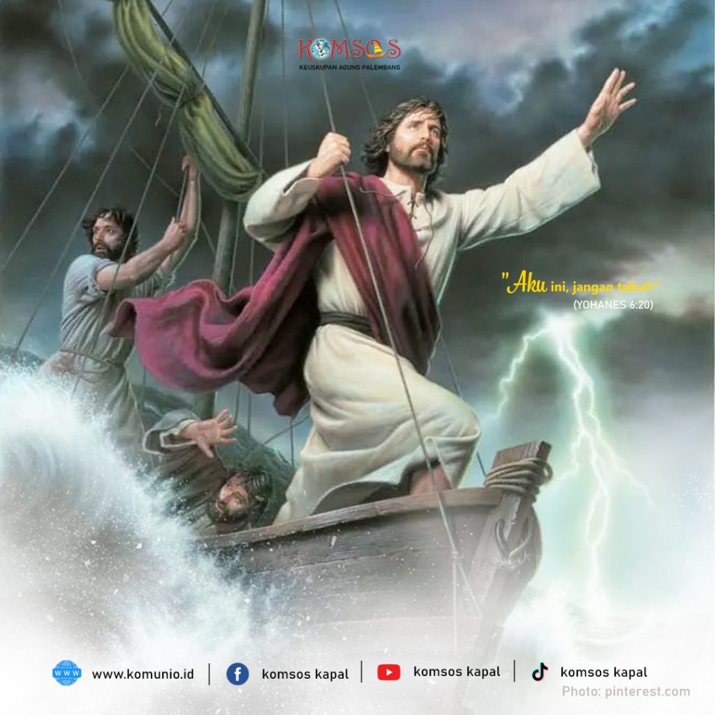 Sesudah mereka mendayung kira-kira dua tiga mil jauhnya, mereka melihat Yesus berjalan di atas air mendekati perahu itu. Maka ketakutanlah mereka. Tetapi Yesus berkata kepada mereka, “Ini Aku, jangan takut!”