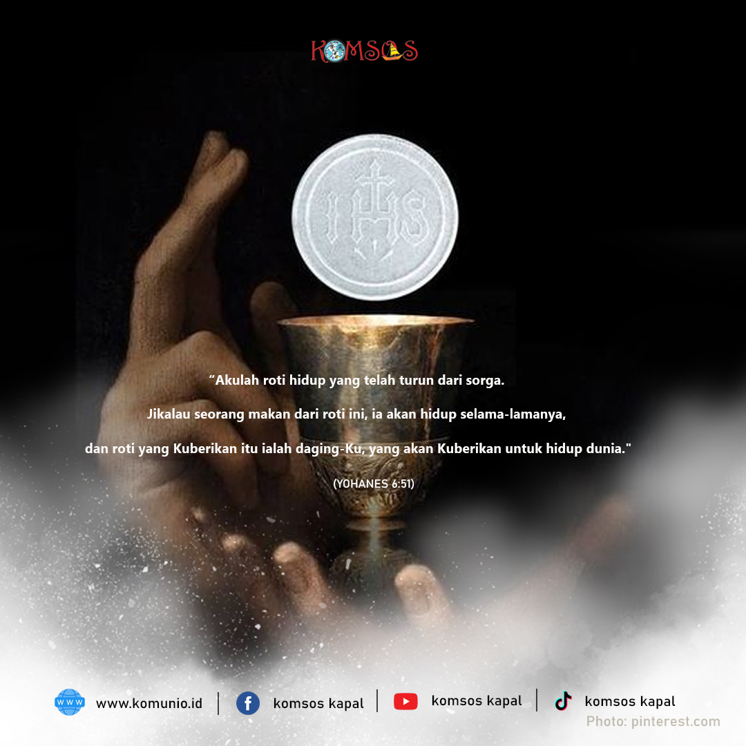 Akulah roti hidup yang telah turun dari surga. Jikalau seorang makan dari roti ini, ia akan hidup selama-lamanya. Dan roti yang Kuberikan itu ialah daging-Ku, yang akan Kuberikan untuk hidup dunia.”