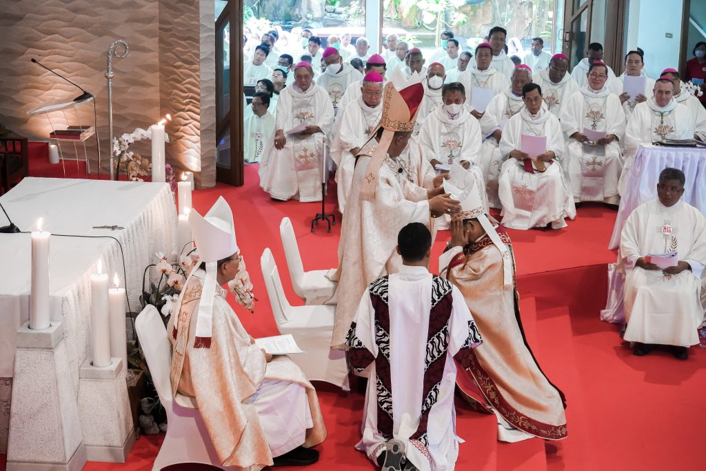 Setelah homili, perayaan berlanjut ke ritus penumpangan tangan dan doa tahbisan, yang menjadi bagian terpenting dalam suatu tahbisan uskup. Lalu, pengurapan minyak krisma, penyerahan Kitab Injil, pemasangan cicin uskup, pengenaan mitra, dan penyerahan tongkat gembala.