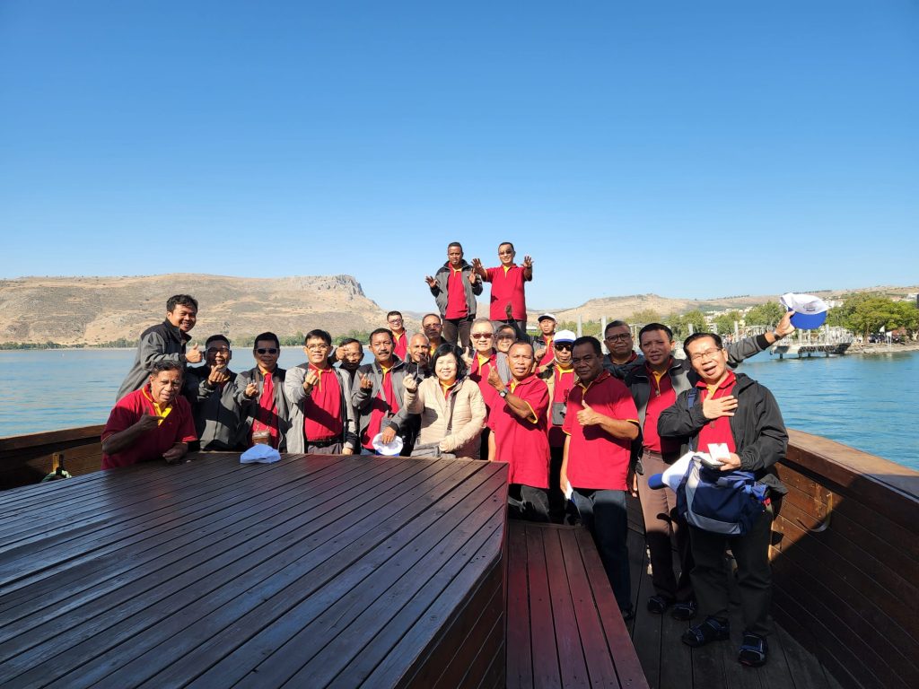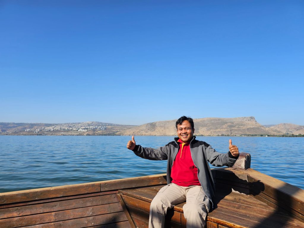 Sebelum muncak, kami rombongan Magdatama group memulai ziarah hari ini menuju ke danau tiberias. Dalam balutan mentari pagi yang lembut kami naik perahu guna mengenang di kala St. Petrus memilih mengandalkan Tuhan daripada mengandalkan kekuatan sendiri.
