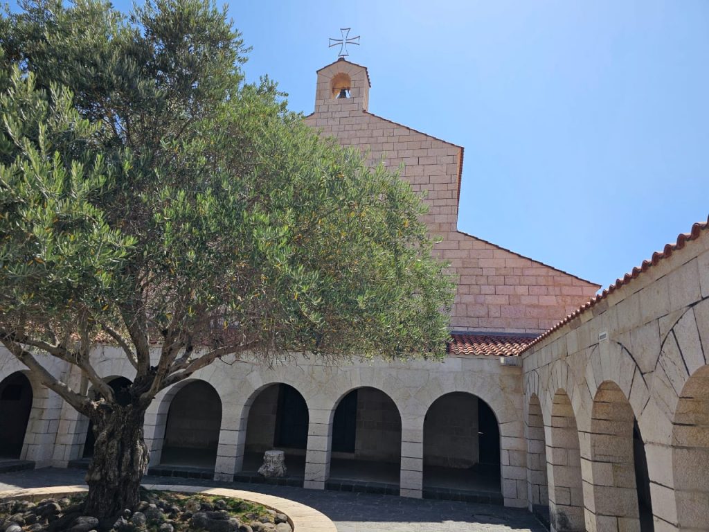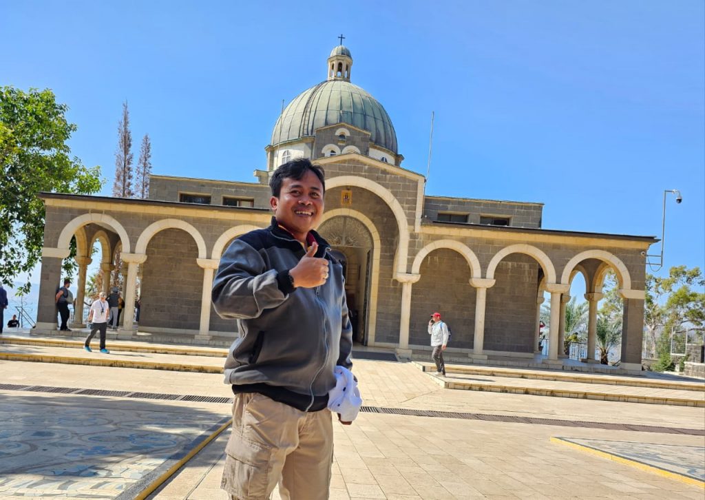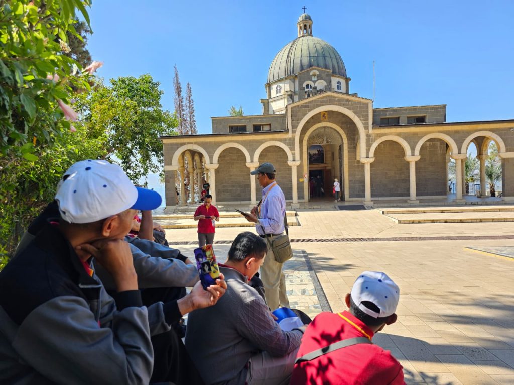Rute selanjutnya, kami mengunjungi Gereja Sabda Bahagia. Situs yang diyakini sebagai tempat Yesus mengajarkan Sabda Bahagia. Kebahagian itu sejatinya bersumber dari kasih Allah yang tiada batas, bukan karena kekayaan atau tanpa masalah lainnya. Kebahagiaan sejatinya harus dibagikan. Oleh sebab itu, kami melanjutkan ziarah menuju Gereja dimana Yesus memberi makan 5000 orang dalam mukjizat penggandaan 5 roti dan 2 ikan. Itulah penegasan bahwa kebahagiaan harus dibagikan; adalah lebih bahagia memberi daripada menerima.