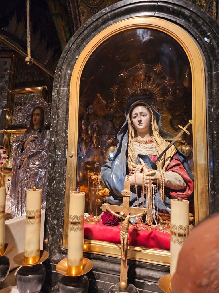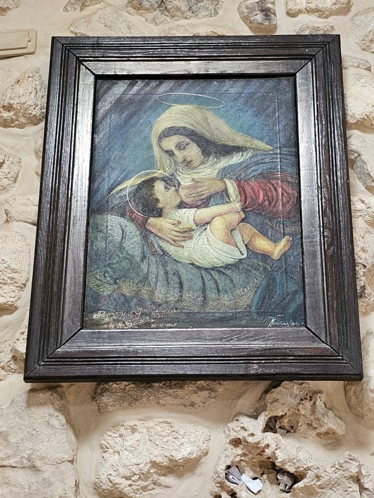 Deretan surat berbingkai dan gambar bayi yang dikirim dari seluruh dunia ke Gua Susu membuktikan keefektifan “susu bubuk” dan doa. Menurut tradisi, ketika Maria dan Yusuf melarikan diri dari tentara Herodes dalam perjalanan mereka ke Mesir, mereka berhenti di gua ini sementara Maria merawat bayi Yesus. Setetes susu Maria jatuh di atas batu dan batu berubah menjadi putih.