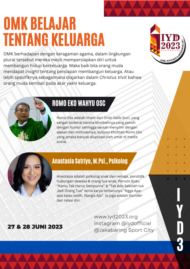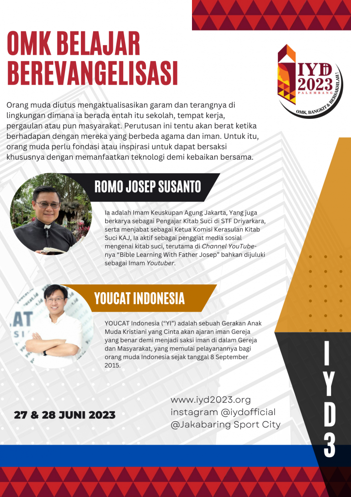 Indonesian Youth Day 2023 adalah moment di mana Orang Muda Katolik (OMK) se-Indonesia berdinamika bersama. Setelah melalui tahapan pra-IYD dengan berefleksi, peserta IYD 3 yang berkumpul Kompleks Jakabaring Sport City (JSC) Kota Palembang siap untuk selebrasi.