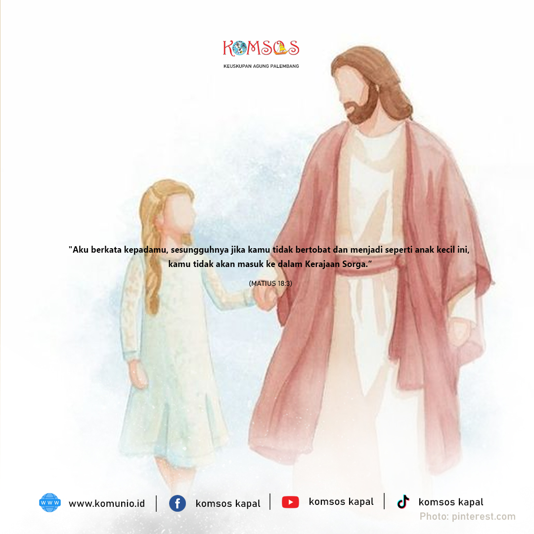 Maka Yesus memanggil seorang anak kecil, dan menempatkannya di tengah-tengah mereka, lalu berkata, “Aku berkata kepadamu: Sungguh, jika kalian tidak bertobat dan menjadi seperti anak kecil ini, kalian tidak akan masuk ke dalam Kerajaan Surga. Sedangkan barangsiapa merendahkan diri dan menjadi seperti anak kecil ini, dialah yang terbesar dalam Kerajaan Surga. Dan barangsiapa menyambut seorang anak seperti ini dalam nama-Ku, ia menyambut Aku. Ingatlah, jangan menganggap rendah seorang pun dari anak-anak kecil ini. Karena Aku berkata kepadamu: Malaikat-malaikat mereka di surga selalu memandang wajah Bapa-Ku yang di surga.”