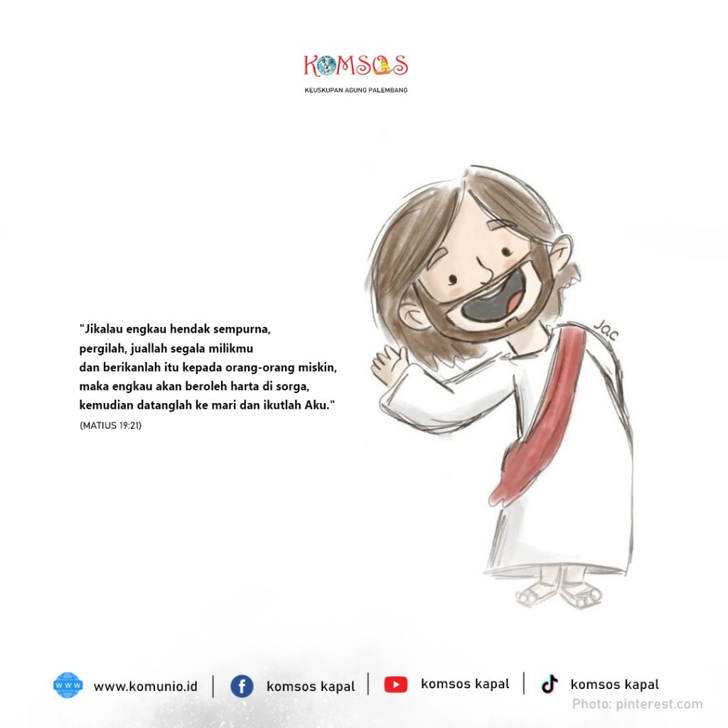 Lalu Yesus berkata, “Jika engkau hendak sempurna, pergilah, juallah segala milikmu, dan berikanlah itu kepada orang-orang miskin, maka engkau akan memperoleh harta di surga. Kemudian datanglah ke mari dan ikutilah Aku.”