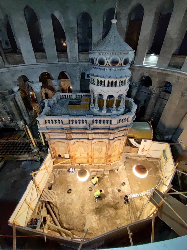 Dari tanggal 19-27 Juni, area di depan edicule dan edicule itu sendiri (bangunan yang ditinggikan di atas tempat makam Kristus) ditutup untuk memungkinkan pemindahan lantai dan penyelidikan arkeologi. Pekerjaan tanpa henti selama tujuh hari tujuh malam mengungkap area pemakaman di area yang sama dengan edicule dan, khususnya, “monumentalisasi” pertama edicule pada periode Kristen awal. (“Monumenalisasi” adalah istilah yang digunakan untuk menggambarkan memperingati atau mengabadikan sesuatu dengan sebuah monumen.)