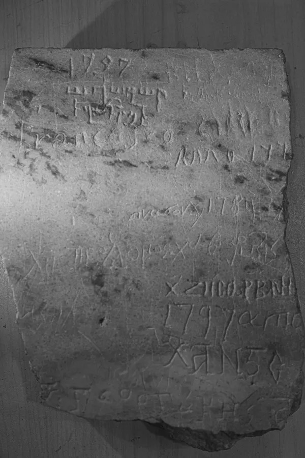 Prasasti para peziarah dalam bahasa Latin, Yunani, dan Armenia (abad ke-18) ditemukan selama penggalian di Basilika Makam Suci di Yerusalem. Kredit: Gianfranco Pinto Ostuni
