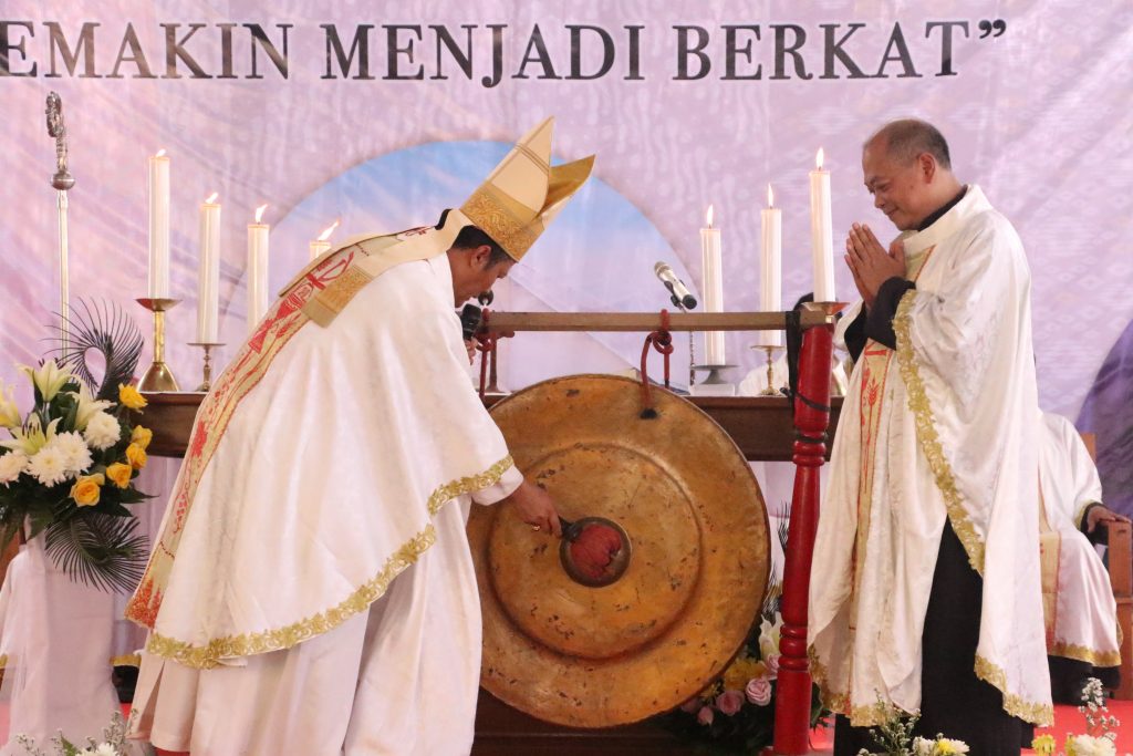 Tiga kali pukulan gong, sembari menyerukan nama Allah Tritunggal Mahakudus: Bapa, Putera, dan Roh Kudus, Uskup…