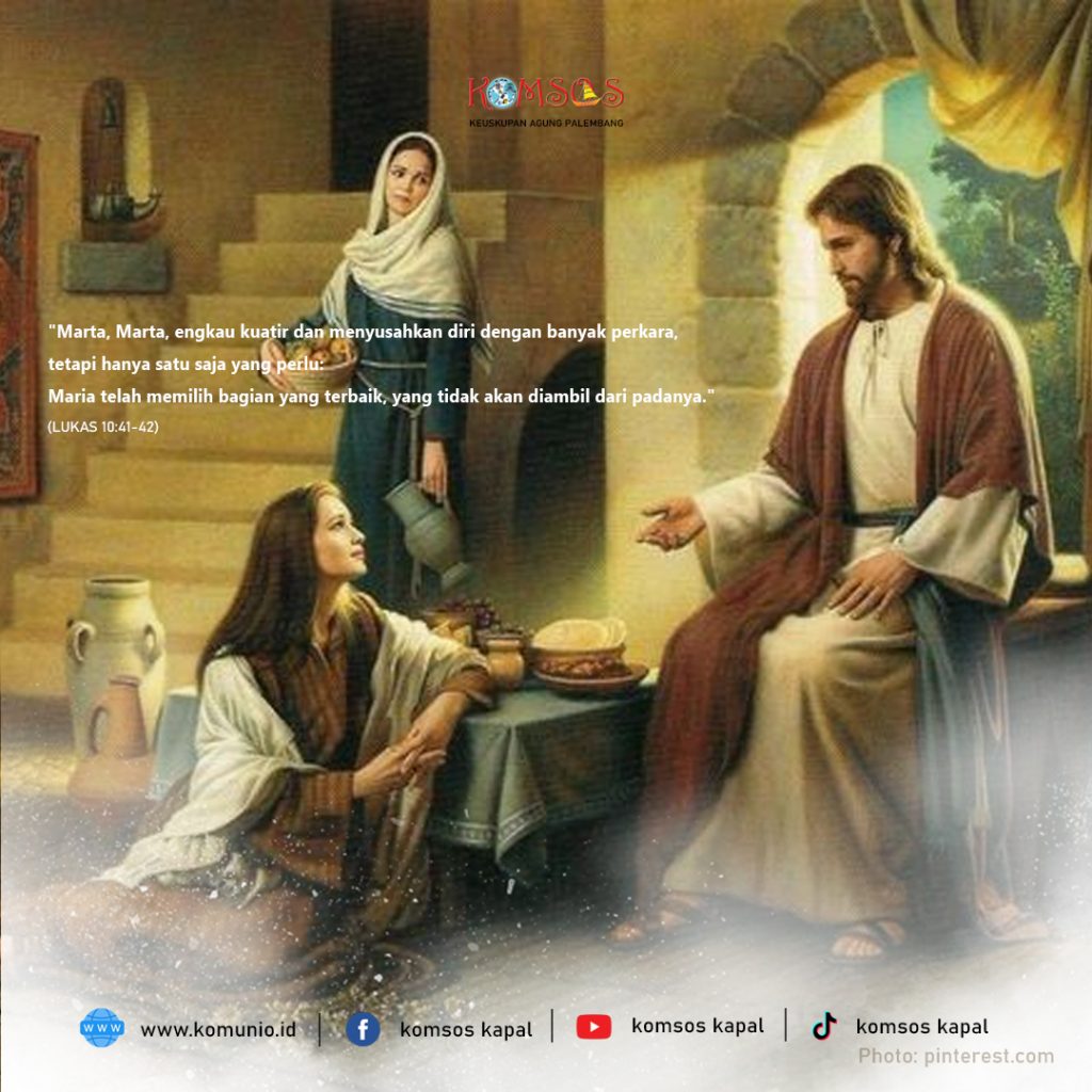 Tetapi Tuhan menjawabnya, “Marta, Marta, engkau kuatir dan menyusahkan diri dengan banyak perkara, padahal hanya satu saja yang perlu. Maria telah memilih bagian yang terbaik, yang tidak akan diambil dari padanya.”