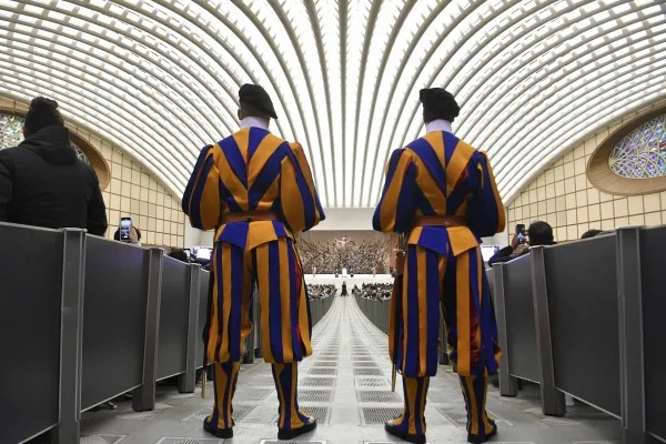 Garda Swiss berdiri di tengah Aula Paulus VI saat audiensi umum Paus Fransiskus pada 10 Januari 2024. Kredit: Media Vatikan