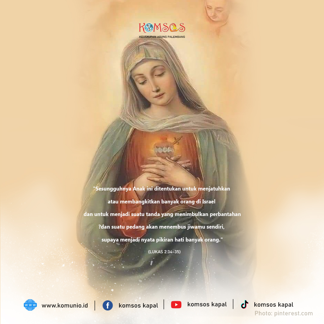Yusuf dan Maria amat heran akan segala sesuatu yang dikatakan tentang Anak Yesus. Lalu Simeon memberkati mereka, dan berkata kepada Maria, ibu Anak itu, “Sesungguhnya Anak ini ditentukan untuk menjatuhkan atau membangkitkan banyak orang di Israel dan untuk menjadi suatu tanda yang menimbulkan perbantahan – dan suatu pedang akan menembus jiwamu sendiri -, supaya menjadi nyata pikiran hati banyak orang.”