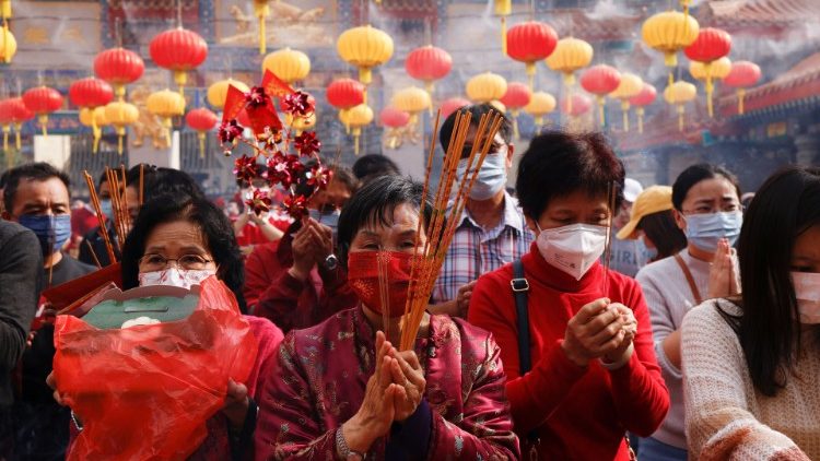 Penganut Tao merayakan Tahun Baru Imlek di Kuil Wong Tai Sin di Hong Kong pada tahun 2021