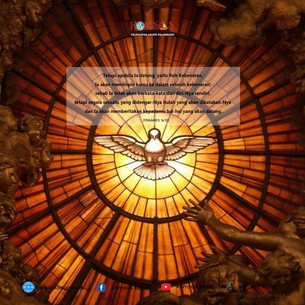 Dalam amanat perpisahan-Nya Yesus berkata kepada murid-murid-Nya, “Jikalau Penghibur yang akan Kuutus dari Bapa datang, yaitu Roh Kebenaran yang keluar dari Bapa, Ia akan bersaksi tentang Aku. Tetapi kamu juga harus bersaksi, karena kamu dari semula bersama-sama dengan Aku. Masih banyak hal yang harus Kukatakan kepadamu, tetapi sekarang kamu belum dapat menanggungnya. Tetapi apabila Roh Kebenaran datang, Ia akan memimpin kamu ke dalam seluruh kebenaran; sebab Ia tidak akan berkata-kata dari diri-Nya sendiri, tetapi segala sesuatu yang didengar-Nya, itulah yang akan dikatakan-Nya, dan Ia akan memberitakan kepadamu hal-hal yang akan datang. Ia akan memuliakan Aku, sebab Ia akan memberitakan kepadamu apa yang Dia diterima dari pada-Ku. Segala sesuatu yang Bapa punya adalah kepunyaan-Ku, sebab itu Aku berkata: Ia akan memberitakan kepadamu apa yang Dia terima dari pada-Ku.”