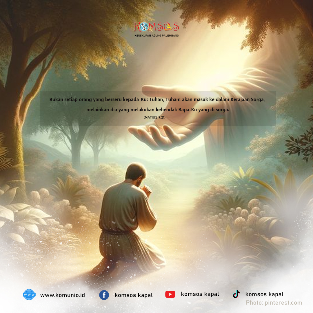Dalam khotbah di bukit Yesus berkata, “Bukan setiap orang yang berseru kepada-Ku, ‘Tuhan, Tuhan!’ akan masuk ke dalam Kerajaan Sorga, melainkan dia yang melakukan kehendak Bapa-Ku di surga. Pada hari terakhir banyak orang akan berseru kepada-Ku, ‘Tuhan, Tuhan, bukankah kami bernubuat demi nama-Mu, dan mengusir setan demi nama-Mu, dan mengadakan banyak mujizat demi nama-Mu juga? Pada waktu itu Aku akan berterus terang kepada mereka dan berkata, ‘Aku tidak pernah mengenal kalian! Enyahlah daripada-Ku, kalian semua pembuat kejahatan!’ Setiap orang yang mendengar perkataan-Ku ini dan melakukannya, ia sama dengan orang bijaksana, yang mendirikan rumahnya di atas wadas. Kemudian turunlah hujan dan datanglah banjir, lalu angin melanda rumah itu, tetapi rumah itu tidak rubuh sebab didirikan di atas wadas. Tetapi setiap orang yang mendengar perkataan-Ku ini dan tidak melakukannya, ia sama dengan orang bodoh, yang mendirikan rumahnya di atas pasir. Kemudian turunlah hujan dan datanglah banjir, lalu angin melanda rumah itu, sehingga rubuhlah rumah itu, dan hebatlah kerusakannya.”
