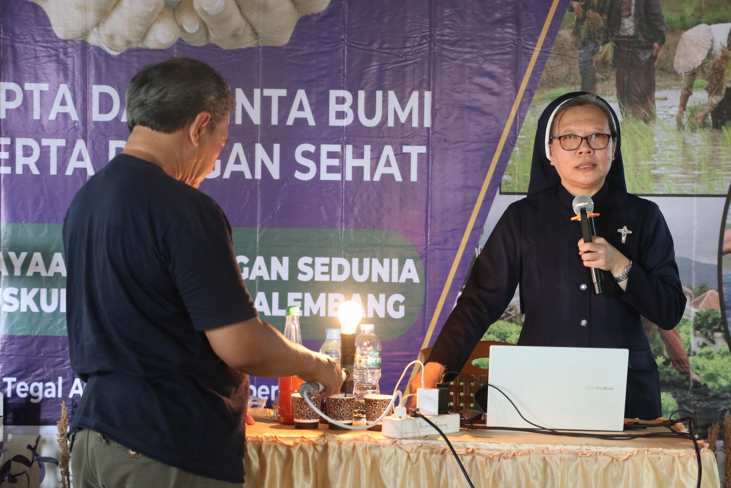 Demo bohlam pijar 100 watt menarik perhatian lebih dari seratus peserta Hari Pangan Sedunia (HPS) Keuskupan Agung Palembang. Sabtu, (12/10) Sr. Marisa Nur Trisna CB dari Komisi Keadilan, Perdamaian, dan Pastoral Migran Perantau Konferensi Waligereja Indonesia Bidang Spiritualitas Lingkungan Hidup, memberikan refleksinya atas tema HPS 2024: Cipta dan Cinta Bumi Serta Pangan Sehat.