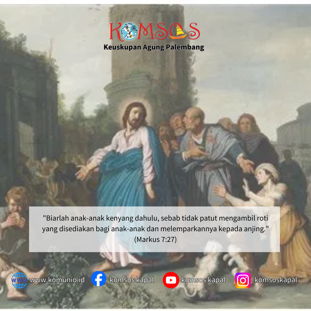 Lalu Yesus berkata kepadanya: “Biarlah anak-anak kenyang dahulu, sebab tidak patut mengambil roti yang disediakan bagi anak-anak dan melemparkannya kepada anjing.” Tetapi perempuan itu menjawab: “Benar, Tuhan. Tetapi anjing yang di bawah meja juga makan remah-remah yang dijatuhkan anak-anak.” Maka kata Yesus kepada perempuan itu: “Karena kata-katamu itu, pergilah sekarang sebab setan itu sudah keluar dari anakmu.” Perempuan itu pulang ke rumahnya, lalu didapatinya anak itu berbaring di tempat tidur, sedang setan itu sudah keluar.