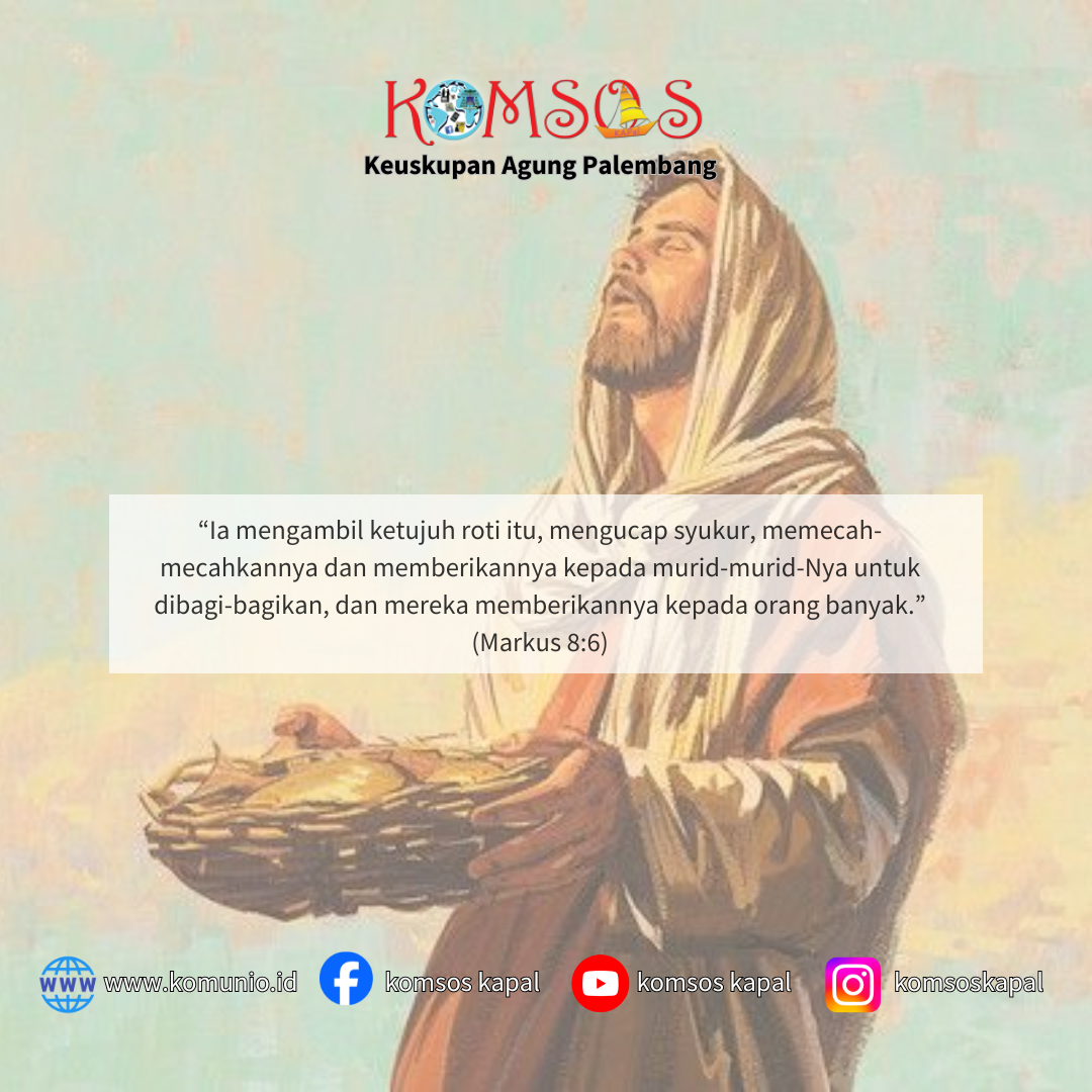Lalu Ia menyuruh orang banyak itu duduk di tanah. Sesudah itu Ia mengambil ketujuh roti itu, mengucap syukur, memecah-mecahkannya dan memberikannya kepada murid-murid-Nya untuk dibagi-bagikan, dan mereka memberikannya kepada orang banyak. Mereka juga mempunyai beberapa ikan, dan sesudah mengucap berkat atasnya, Ia menyuruh supaya ikan itu juga dibagi-bagikan. Dan mereka makan sampai kenyang. Kemudian orang mengumpulkan potongan-potongan roti yang sisa, sebanyak tujuh bakul. Mereka itu ada kira-kira empat ribu orang. Lalu Yesus menyuruh mereka pulang. Ia segera naik ke perahu dengan murid-murid-Nya dan bertolak ke daerah Dalmanuta.