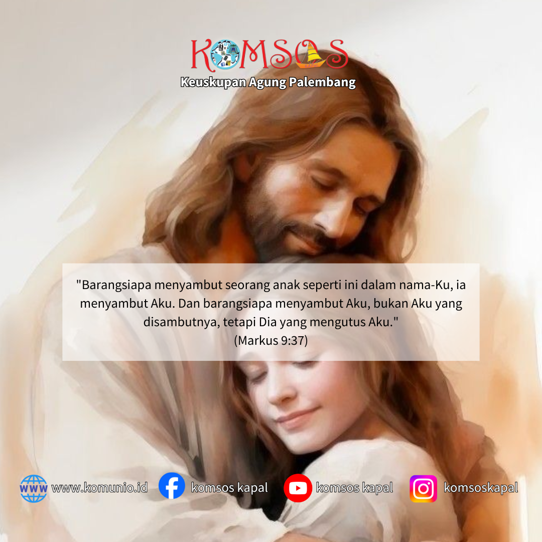 Maka Yesus mengambil seorang anak kecil dan menempatkannya di tengah-tengah mereka, kemudian Ia memeluk anak itu dan berkata kepada mereka: “Barangsiapa menyambut seorang anak seperti ini dalam nama-Ku, ia menyambut Aku. Dan barangsiapa menyambut Aku, bukan Aku yang disambutnya, tetapi Dia yang mengutus Aku.”
