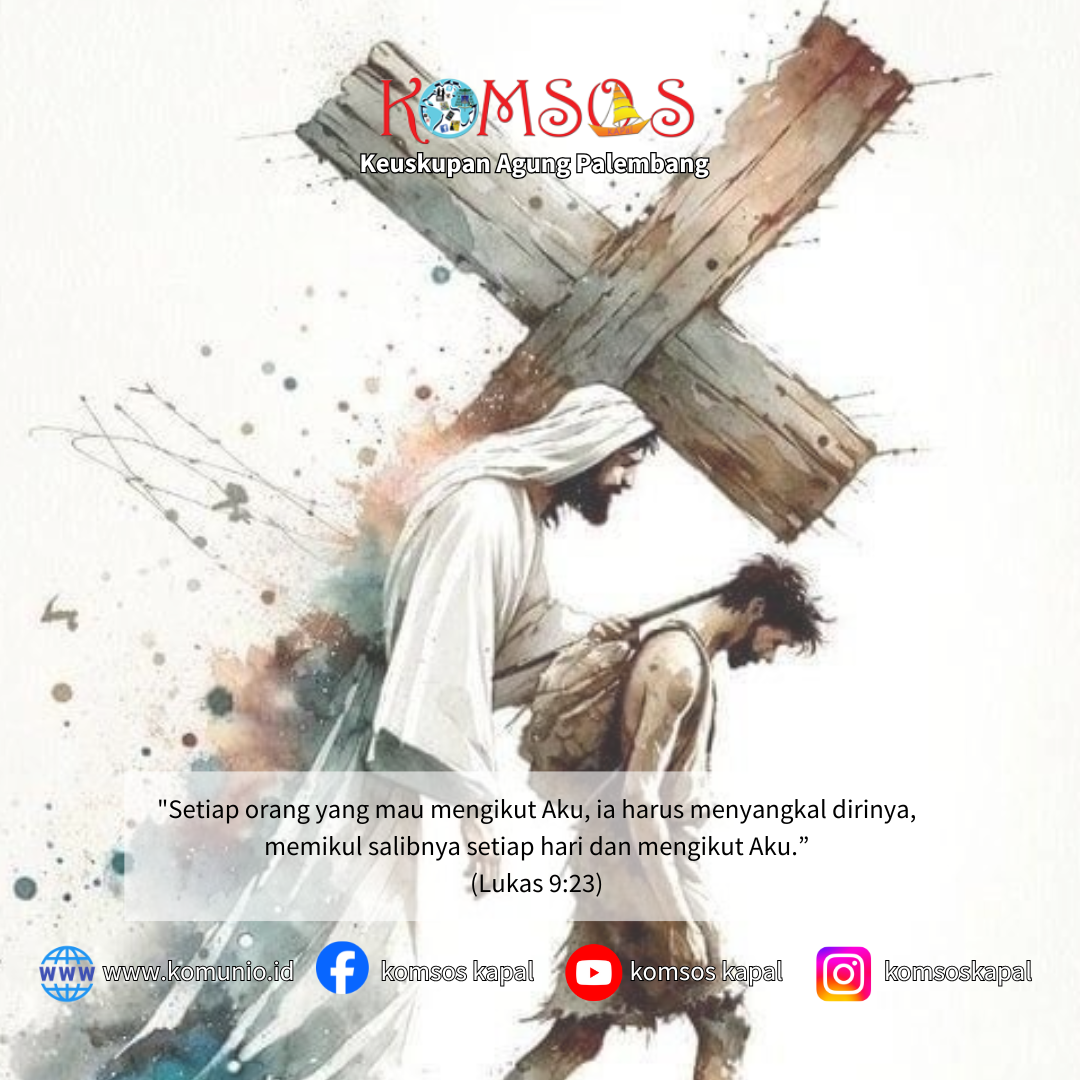 Kata-Nya kepada mereka semua: “Setiap orang yang mau mengikut Aku, ia harus menyangkal dirinya, memikul salibnya setiap hari dan mengikut Aku. Karena barangsiapa mau menyelamatkan nyawanya, ia akan kehilangan nyawanya; tetapi barangsiapa kehilangan nyawanya karena Aku, ia akan menyelamatkannya. Apa gunanya seorang memperoleh seluruh dunia, tetapi ia membinasakan atau merugikan dirinya sendiri?