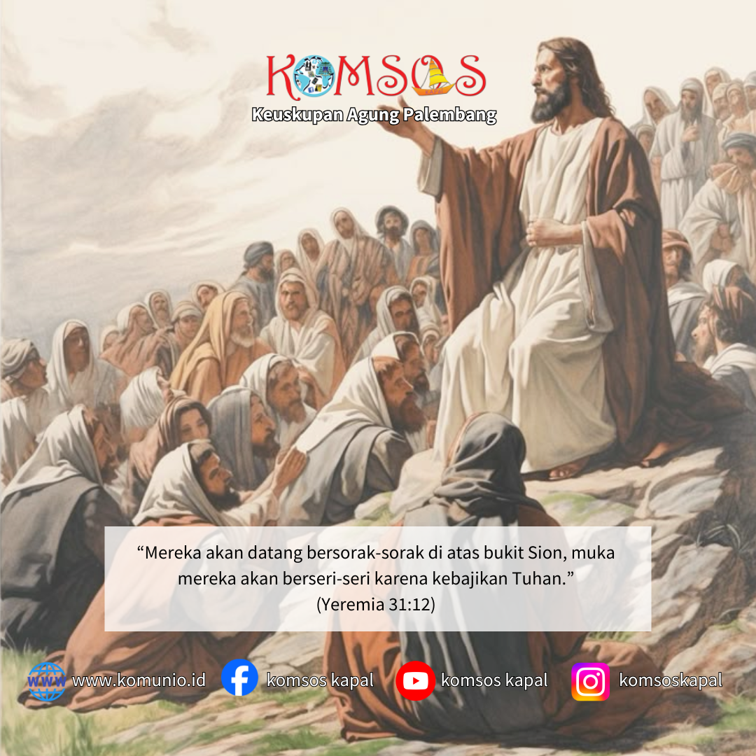 *Sebab Tuhan telah membebaskan Yakub, telah menebusnya dari tangan orang yang lebih kuat dari padanya. Mereka akan datang bersorak-sorak di atas bukit Sion, muka mereka akan berseri-seri karena kebajikan Tuhan.