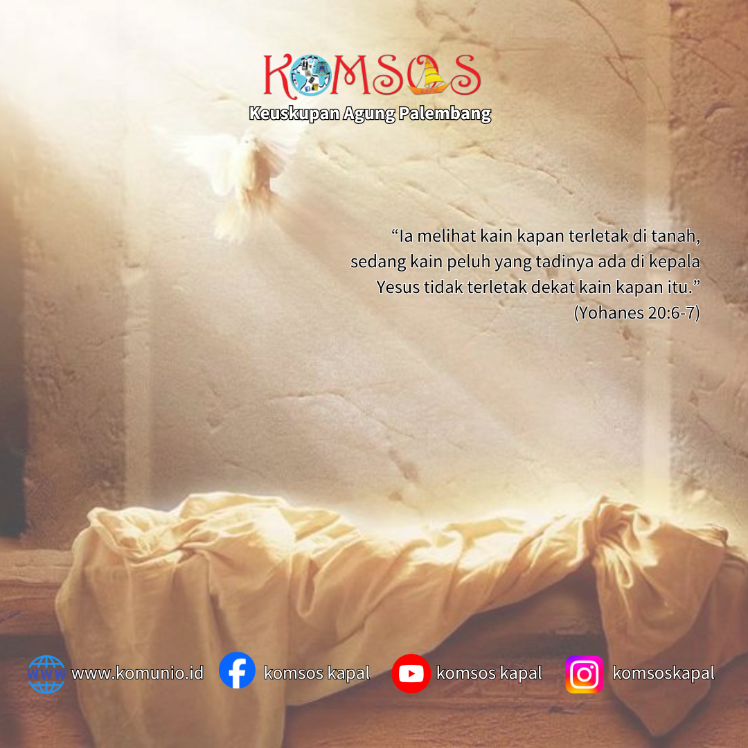 Maka berangkatlah Petrus dan murid yang lain itu ke kubur. Keduanya berlari bersama-sama, tetapi murid yang lain itu berlari lebih cepat dari pada Petrus sehingga lebih dahulu sampai di kubur. Ia menjenguk ke dalam, dan melihat kain kapan terletak di tanah; akan tetapi ia tidak masuk ke dalam. Maka datanglah Simon Petrus juga menyusul dia dan masuk ke dalam kubur itu. Ia melihat kain kapan terletak di tanah, sedang kain peluh yang tadinya ada di kepala Yesus tidak terletak dekat kain kapan itu, tetapi agak di samping di tempat yang lain dan sudah tergulung.