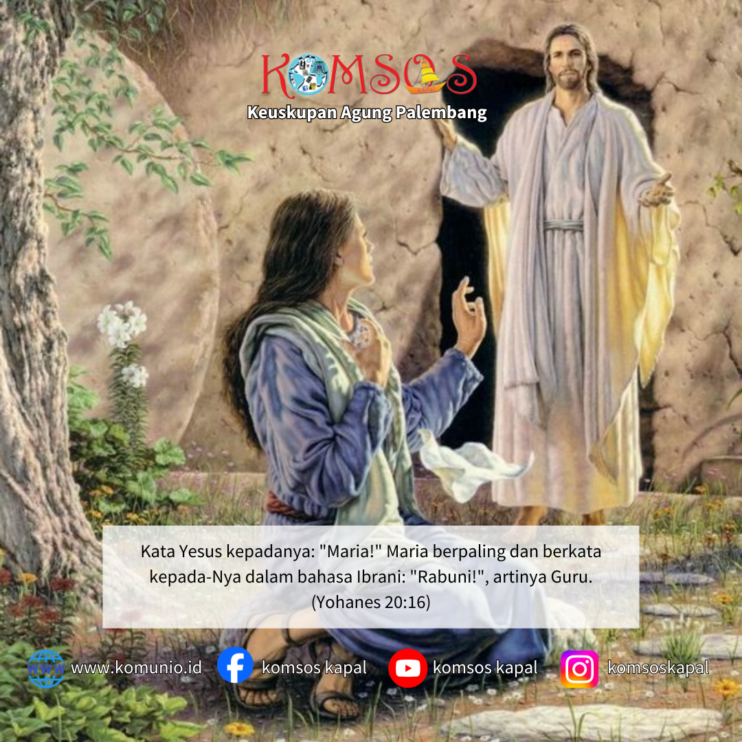 Kata Yesus kepadanya: “Maria!” Maria berpaling dan berkata kepada-Nya dalam bahasa Ibrani: “Rabuni!”, artinya Guru. Kata Yesus kepadanya: “Janganlah engkau memegang Aku, sebab Aku belum pergi kepada Bapa, tetapi pergilah kepada saudara-saudara-Ku dan katakanlah kepada mereka, bahwa sekarang Aku akan pergi kepada Bapa-Ku dan Bapamu, kepada Allah-Ku dan Allahmu.”