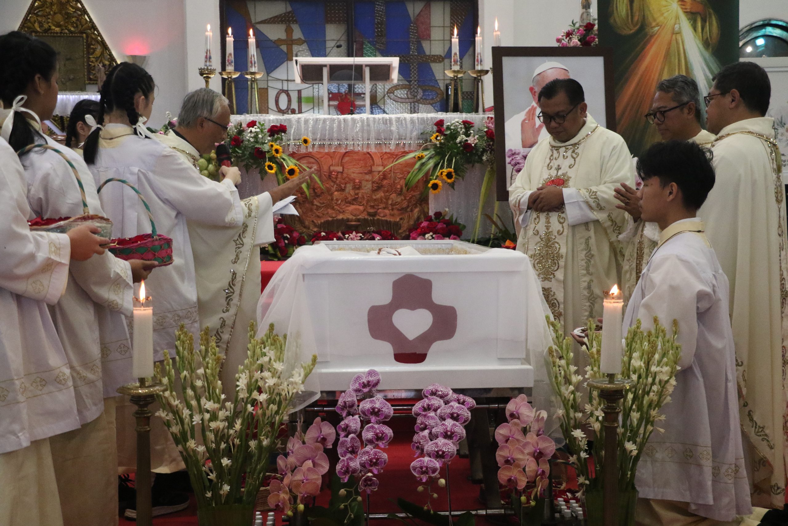 Selanjutnya, keluarga dan umat serta para konfrater memberikan penghormatan terakhir. Jenazah dimakamkan di Taman Getsemani, Charitas Hospital.