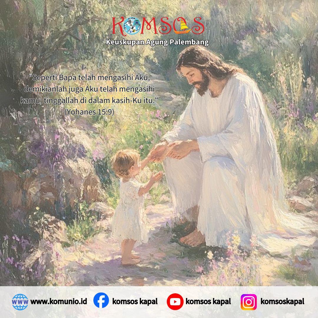 Dalam amanat perpisahan-Nya, Yesus berkata kepada murid-murid-Nya, “Seperti Bapa telah mengasihi Aku, demikianlah juga Aku telah mengasihi kamu; tinggallah di dalam kasih-Ku itu. Jikalau kamu menuruti perintah-Ku, kamu akan tinggal di dalam kasih-Ku, seperti Aku menuruti perintah Bapa-Ku dan tinggal di dalam kasih-Nya.
