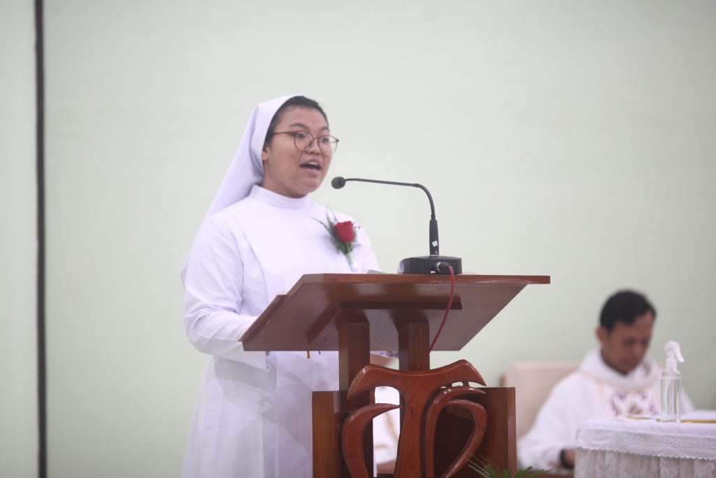 Mewakili para pestawati, Sr. M. Jequina FCh seraya berterima kasih atas hari yang istimewa, dalam sambutannya juga menyampaikan niat bersama untuk tetap tekun dan setia pada panggilan yang Tuhan berikan kepada mereka. Menurutnya keberanian untuk menjawab ‘ya’ semakin dimurnikan dan diteguhkan lewat retret yang dipimpin oleh Magistra Postulan, Sr. M. Paula FCh dengan tema Tuhan Memanggilku; Aku Menjawab ‘Ya Tuhan’.