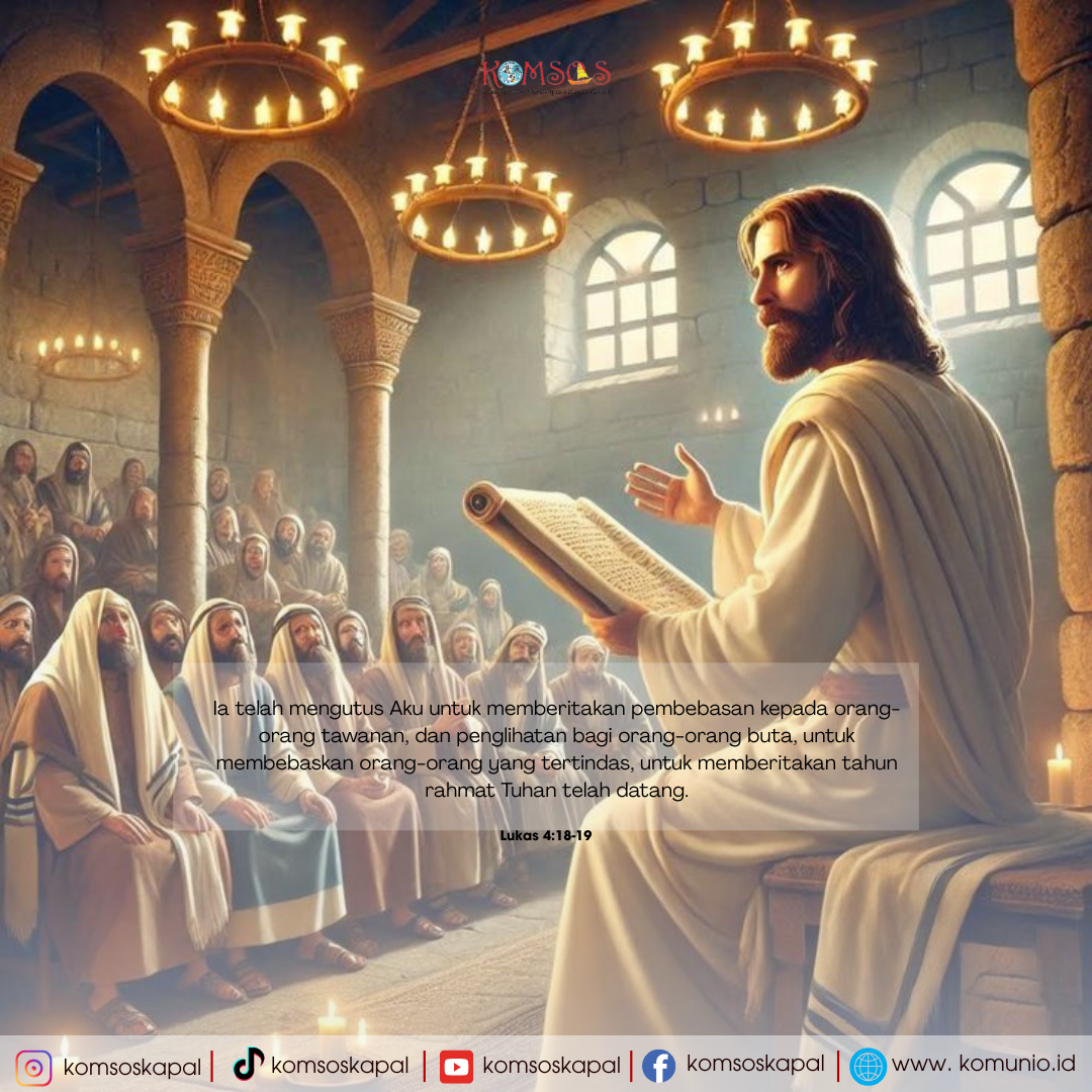 Sekali peristiwa datanglah Yesus di Nazaret tempat Ia dibesarkan, dan menurut kebiasaan-Nya pada hari Sabat Ia masuk ke rumah ibadat, lalu berdiri hendak membaca dari Alkitab. Kepada-Nya diberikan kitab nabi Yesaya dan setelah dibuka-Nya, Ia menemukan nas, di mana ada tertulis: “Roh Tuhan ada pada-Ku, oleh sebab Ia telah mengurapi Aku, untuk menyampaikan kabar baik kepada orang-orang miskin; dan Ia telah mengutus Aku untuk memberitakan pembebasan kepada orang-orang tawanan, dan penglihatan bagi orang-orang buta, untuk membebaskan orang-orang yang tertindas, untuk memberitakan tahun rahmat Tuhan telah datang.”