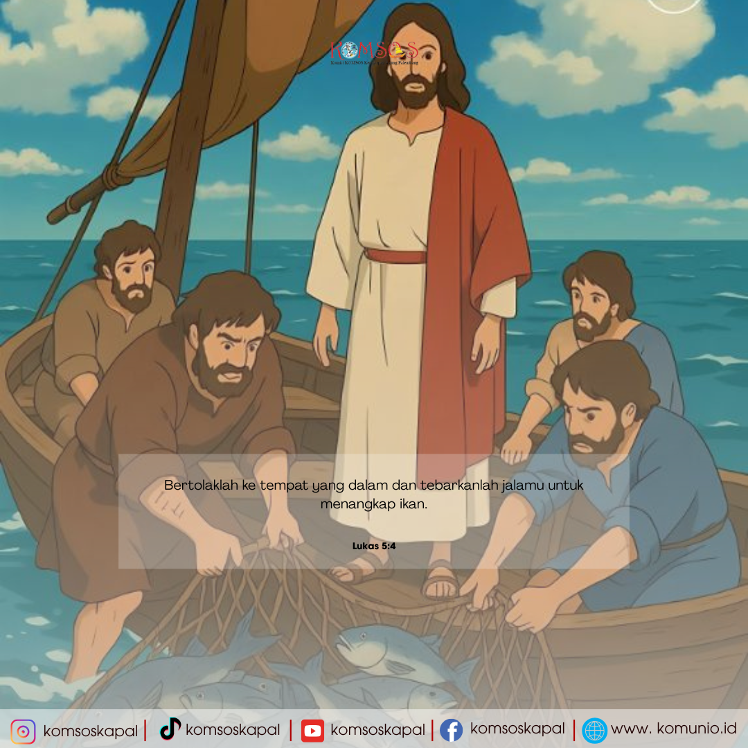 Selesai berbicara Ia berkata kepada Simon, “Bertolaklah ke tempat yang dalam dan tebarkanlah jalamu untuk menangkap ikan.” Simon menjawab, “Guru, telah sepanjang malam kami bekerja keras dan kami tidak menangkap apa-apa. Tetapi atas perintah-Mu aku akan menebarkan jala juga.”