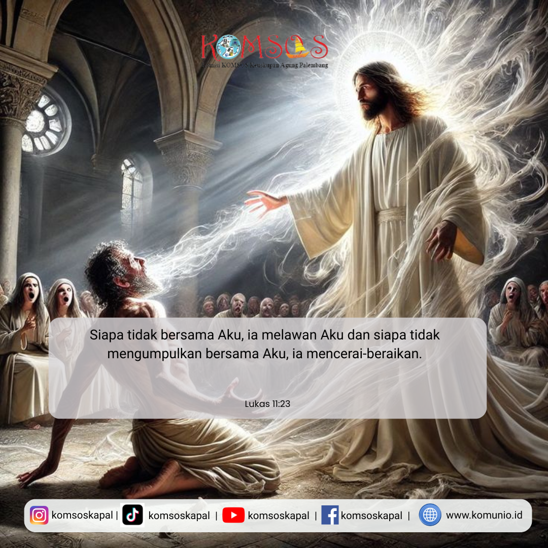 Siapa tidak bersama Aku, ia melawan Aku dan siapa tidak mengumpulkan bersama Aku, ia mencerai-beraikan.” “Apabila roh jahat keluar dari manusia, iapun mengembara ke tempat-tempat yang tandus mencari perhentian, dan karena ia tidak mendapatnya, ia berkata: Aku akan kembali ke rumah yang telah kutinggalkan itu.