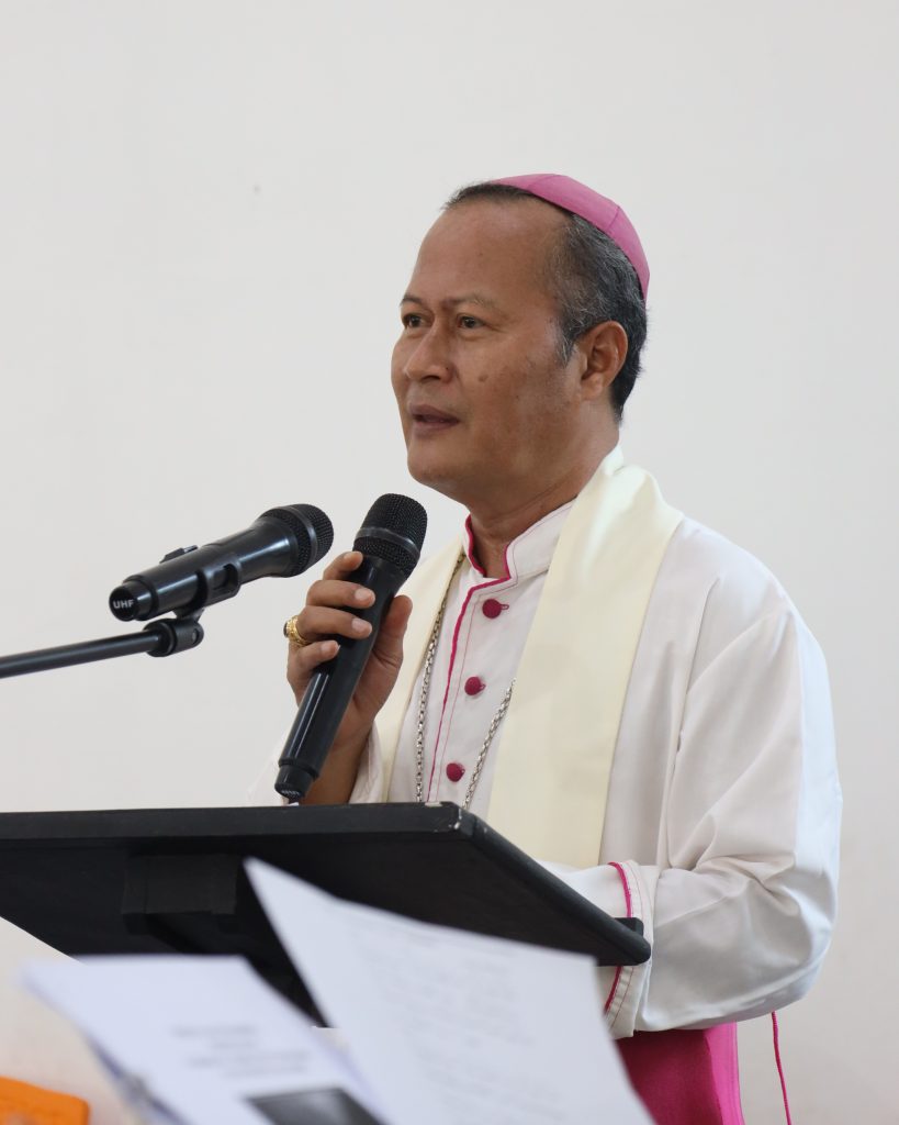 Mgr. Yohanes memberikan homili dalam pemberkatan gedung pastoran Paroki Payo Selincah