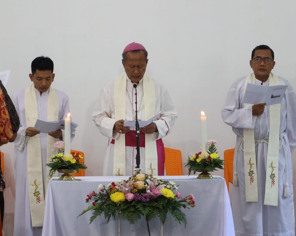 Mgr. Yohanes Harun Yuwono didampingi oleh Pastor F.X. Tri Priyo Widarto SCJ dan Pastor Romanus Edi Suryono.