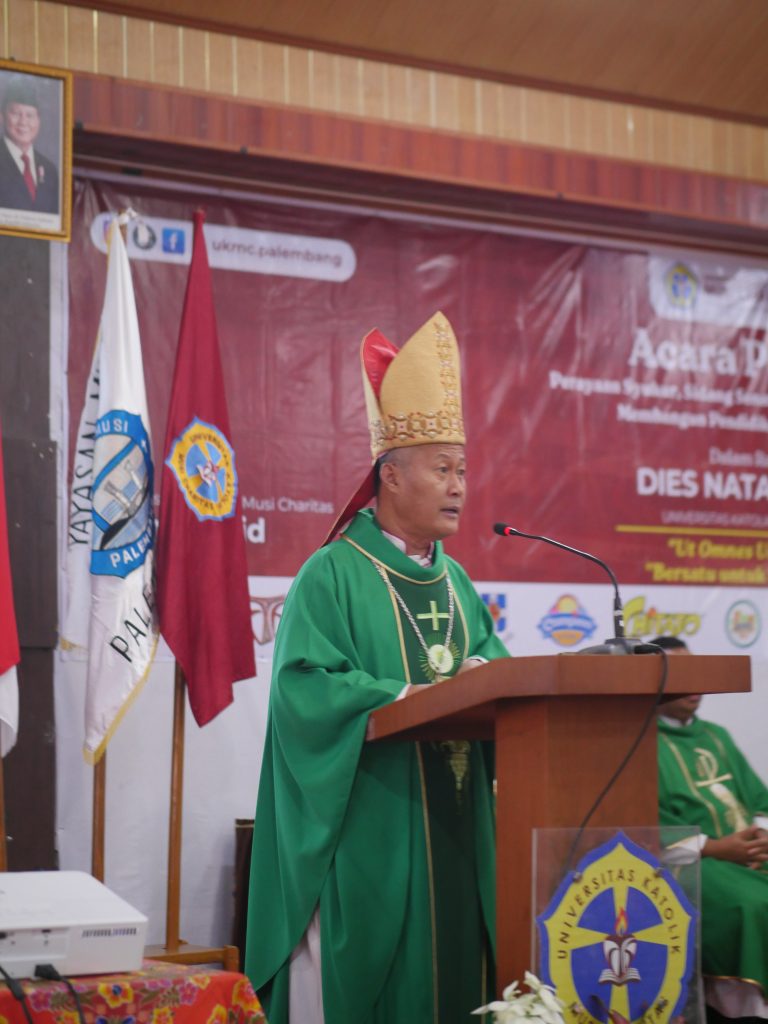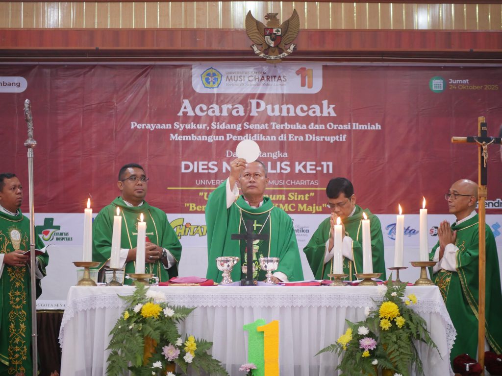 Demikian diungkapkan oleh Uskup Agung Palembang sekaligus Ketua Pembina Yayasan Musi Palembang, Mgr. Yohanes Harun Yowono dalam homilinya saat memimpin Perayaan Ekaristi Dies Natalis Ke- 11 Universitas Katolik Musi Charitas Palembang, di Aula Gedung Yoseph, Fakultas Sains dan Teknologi, Jumat (24/10/2025) pekan lalu.