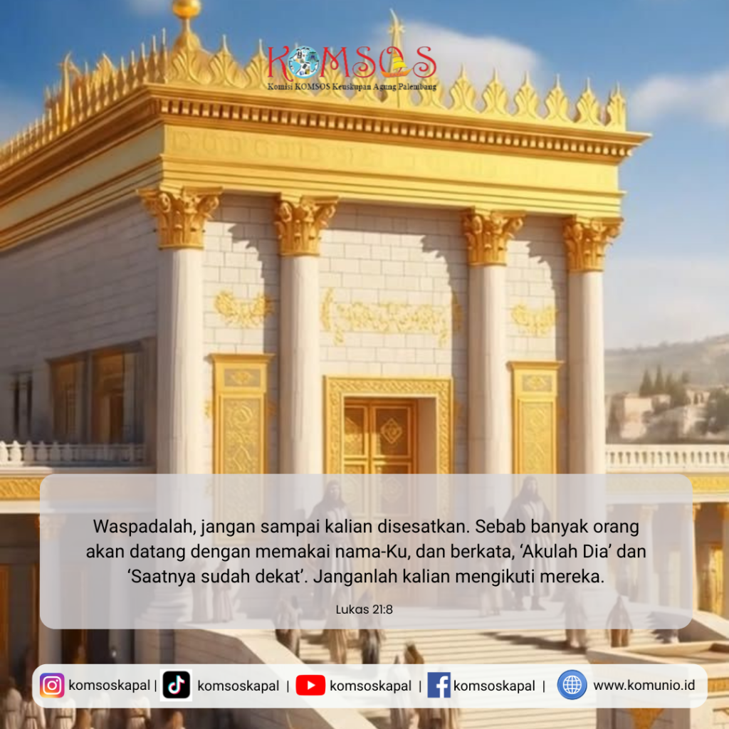 Lalu murid-murid bertanya, “Guru, bilamanakah hal itu akan terjadi? Dan apakah tandanya, kalau itu akan terjadi?” Jawab Yesus, “Waspadalah, jangan sampai kalian disesatkan. Sebab banyak orang akan datang dengan memakai nama-Ku, dan berkata, ‘Akulah Dia’ dan ‘Saatnya sudah dekat’. Janganlah kalian mengikuti mereka. Dan bila kalian mendengar kabar tentang perang dan pemberontakan, janganlah kalian terkejut. Sebab semuanya itu harus terjadi dahulu, tetapi itu tidak berarti kesudahannya akan datang segera.”