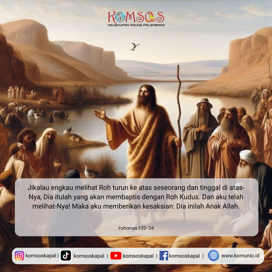 Ketika Yohanes membaptis di Sungai Yordan, Ia melihat Yesus datang kepadanya. Maka katanya, “Lihatlah Anak Domba Allah yang menghapus dosa dunia. Dialah yang kumaksud ketika kukatakan: Sesudah aku akan datang seorang yang telah mendahului aku, sebab Dia telah ada sebelum aku. Aku sendiripun mula-mula tidak mengenal Dia, tetapi Yang mengutus aku membaptis dengan air telah berfirman: Jikalau engkau melihat Roh turun ke atas seseorang dan tinggal di atas-Nya, Dia itulah yang akan membaptis dengan Roh Kudus. Dan aku telah melihat-Nya! Maka aku memberikan kesaksian: Dia inilah Anak Allah.”