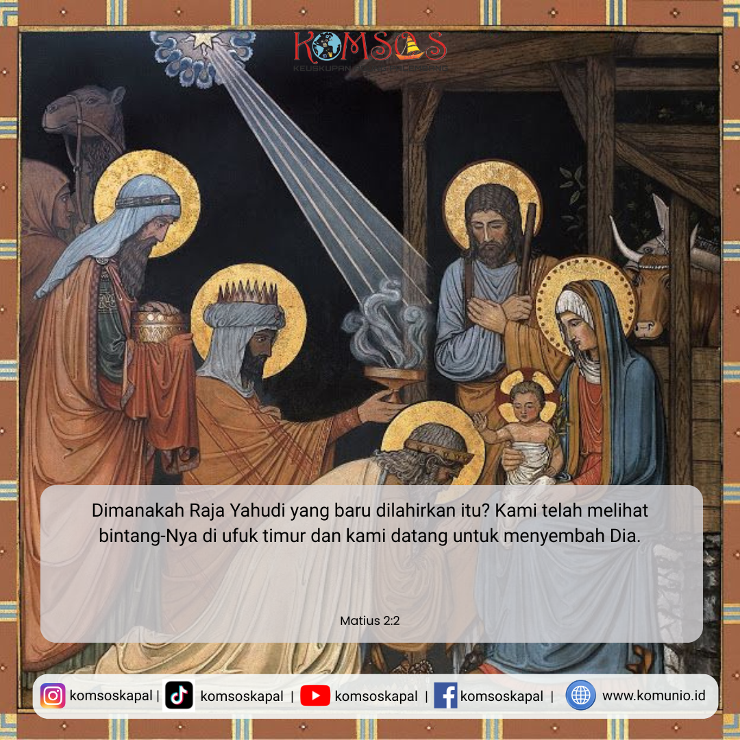 Pada zaman pemerintahan raja Herodes, sesudah Yesus dilahirkan di Betlehem di tanah Yudea, datanglah orang-orang majus dari timur ke Yerusalem. Mereka bertanya-tanya, “Dimanakah Raja Yahudi yang baru dilahirkan itu? Kami telah melihat bintang-Nya di ufuk timur dan kami datang untuk menyembah Dia.” Mendengar hal itu, terkejutlah Raja Herodes beserta seluruh Yerusalem. Maka dikumpulkannya semua imam kepala dan ahli Taurat bangsa Yahudi, lalu dimintanya kete-rangan dari mereka, di mana Mesias akan dilahirkan. Mereka berkata kepadanya, “Di Betlehem di tanah Yudea, karena beginilah ada tertulis dalam kitab nabi: Dan engkau, Betlehem di tanah Yehuda, engkau sekali-kali bukanlah yang terkecil di antara mereka yang memerintah Yehuda karena dari padamulah akan bangkit seorang pemimpin, yang akan menggembalakan umat-Ku Israel.” Lalu dengan diam-diam Herodes memanggil orang-orang majus itu, dan dengan teliti bertanya kepada mereka kapan bintang itu nampak. Kemudian ia menyuruh mereka ke Betlehem, katanya, “Pergilah, dan selidikilah dengan saksama hal-ikhwal Anak itu! Dan segera sesudah kamu menemukan Dia, kabarkanlah kepadaku, supaya aku pun datang menyembah Dia.” Setelah mendengar kata-kata Raja Herodes, berangkatlah para majus itu. Dan lihatlah, bintang yang mereka lihat di timur itu mendahului mereka hingga tiba dan berhenti di atas tempat di mana Anak itu berada. Melihat bintang itu, sangat bersukacitalah mereka. Maka masuklah mereka ke dalam rumah itu, dan melihat Anak itu bersama Maria, ibu-Nya. Lalu mereka sujud menyembah Dia. Mereka pun membuka tempat harta bendanya, dan mempersembahkan persembahan kepada Anak itu, yaitu emas, kemenyan dan mur. Kemudian, karena diperingatkan dalam mimpi supaya jangan kembali kepada Herodes, mereka pun pulang ke negerinya lewat jalan lain.