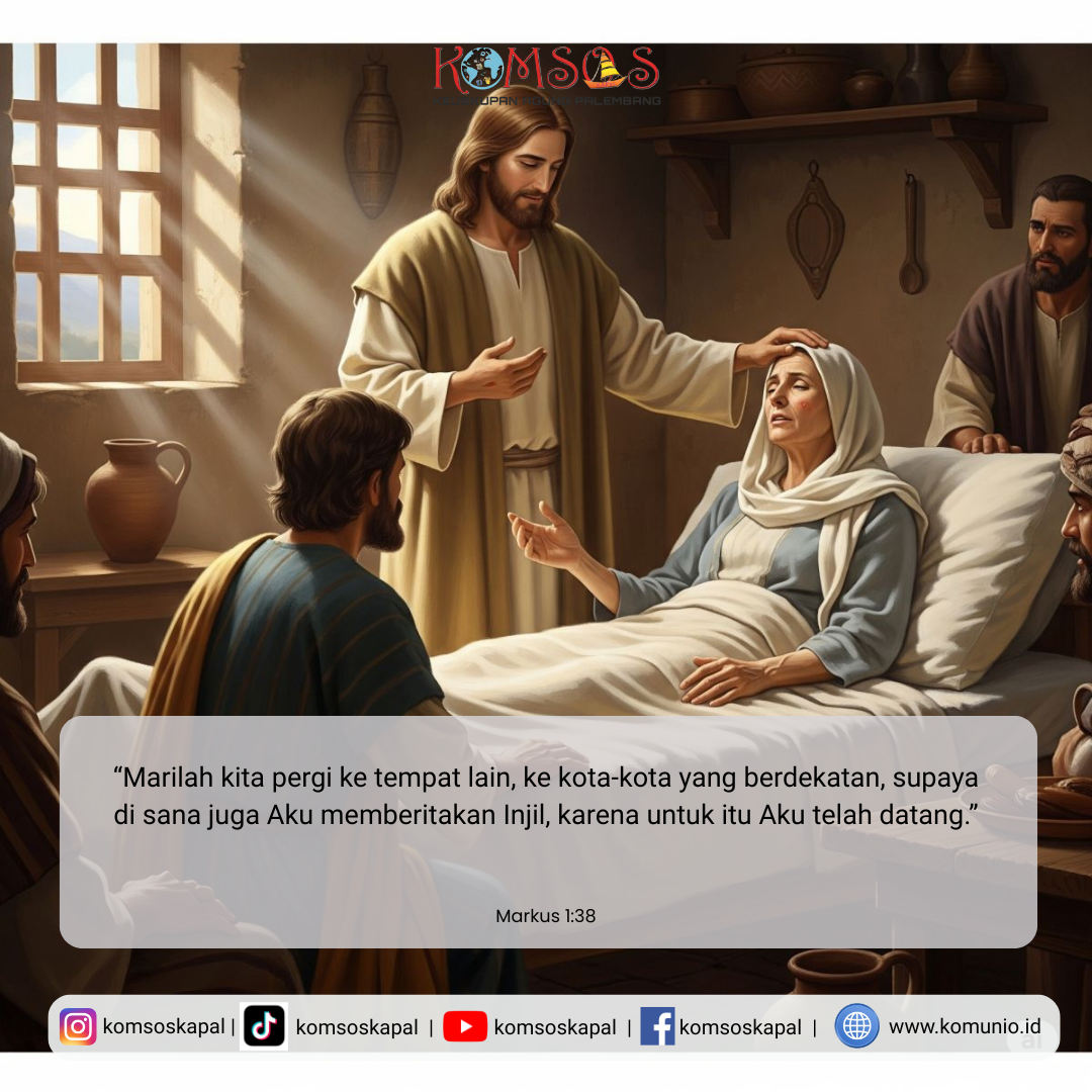 Keesokan harinya, waktu hari masih gelap, Yesus bangun dan pergi keluar. Ia pergi ke tempat yang sunyi, dan berdoa di sana. Tetapi Simon dan kawan-kawannya menyusul Yesus. Waktu menemukan Yesus, mereka berkata: “Semua orang mencari Engkau.” Jawab Yesus, “Marilah kita pergi ke tempat lain, ke kota-kota yang berdekatan, supaya di sana juga Aku memberitakan Injil, karena untuk itu Aku telah datang.” Lalu pergilah Yesus ke seluruh Galilea, memberitakan Injil dalam rumah-rumah ibadat mereka dan mengusir setan-setan.