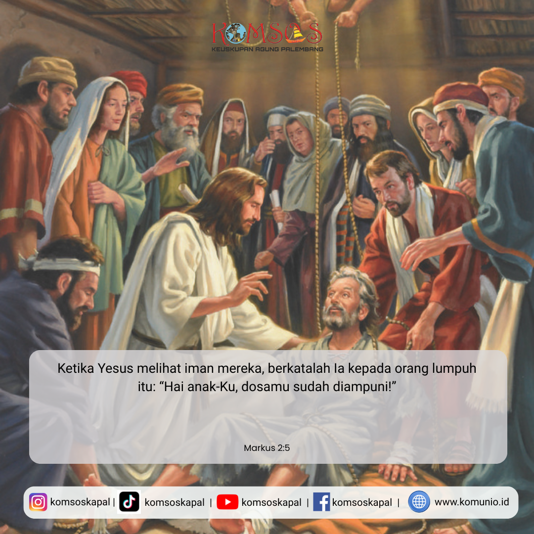 Tetapi Yesus segera mengetahui dalam hati-Nya, bahwa mereka berpikir demikian, lalu Ia berkata kepada mereka: “Mengapa kamu berpikir begitu dalam hatimu? Manakah lebih mudah, mengatakan kepada orang lumpuh ini: Dosamu sudah diampuni, atau mengatakan: Bangunlah, angkatlah tilammu dan berjalan? Tetapi supaya kamu tahu, bahwa di dunia ini Anak Manusia berkuasa mengampuni dosa.” berkatalah Ia kepada orang lumpuh itu: “Kepadamu Kukatakan, bangunlah, angkatlah tempat tidurmu dan pulanglah ke rumahmu!”