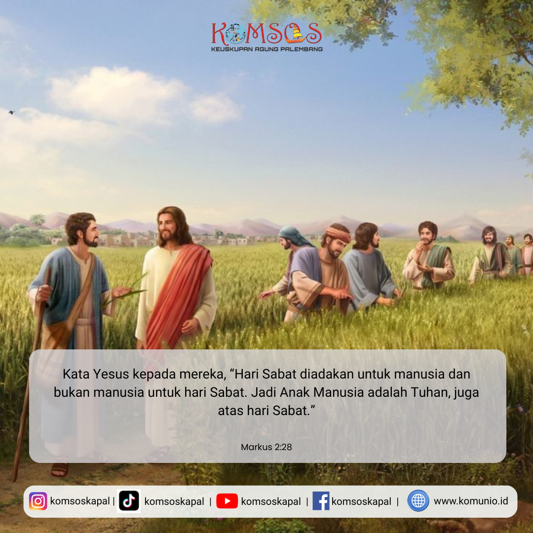 Pada suatu hari Sabat, Yesus berjalan di ladang gandum, dan sementara berjalan murid-murid-Nya memetik bulir gandum. Maka kata orang-orang Farisi kepada Yesus, “Lihat! Mengapa mereka berbuat sesuatu yang tidak diperbolehkan pada hari Sabat?” Jawab Yesus kepada mereka, “Belum pernahkah kamu baca apa yang dilakukan Daud, ketika ia dan para pengiringnya kekurangan dan kelaparan? Tidakkah ia masuk ke dalam Rumah Allah waktu Abyatar menjabat sebagai Imam Agung lalu makan roti sajian yang tidak boleh dimakan kecuali oleh imam-imam dan memberikannya juga kepada pengikut-pengikutnya?” Lalu kata Yesus kepada mereka, “Hari Sabat diadakan untuk manusia dan bukan manusia untuk hari Sabat. Jadi Anak Manusia adalah Tuhan, juga atas hari Sabat.”